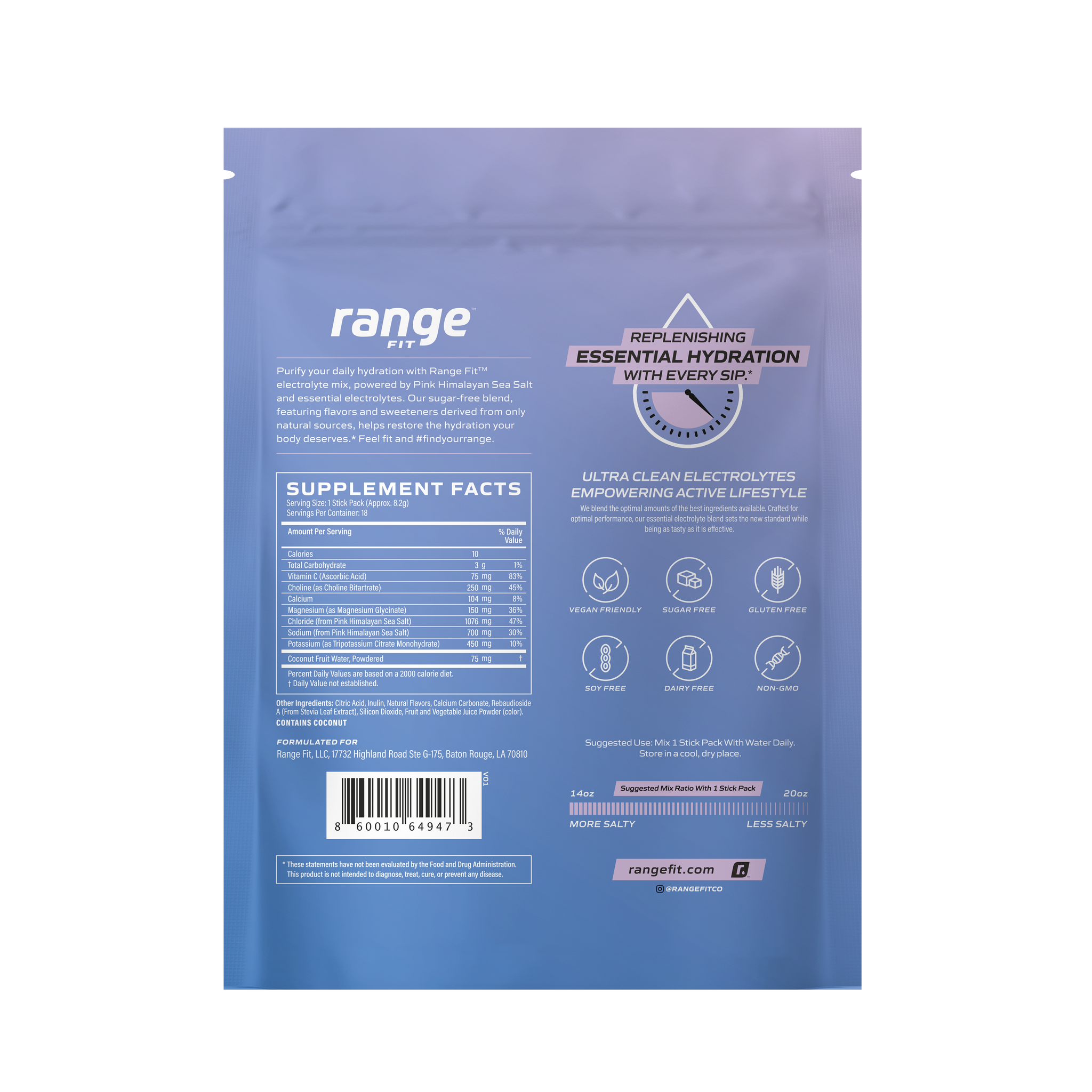 Generally, hydration powder supplements carry a 2-year shelf-life. With our specially selected ingredients and its natural ability to maintain its freshness, such as the use of premium Pink Himalayan Sea Salt and the inherent low moisture content, an unsealed package of our electrolyte hydration mix can maintain its wholesomeness far beyond the time of manufacturer, which is indicated on each package of Range Fit electrolyte hydration mix.